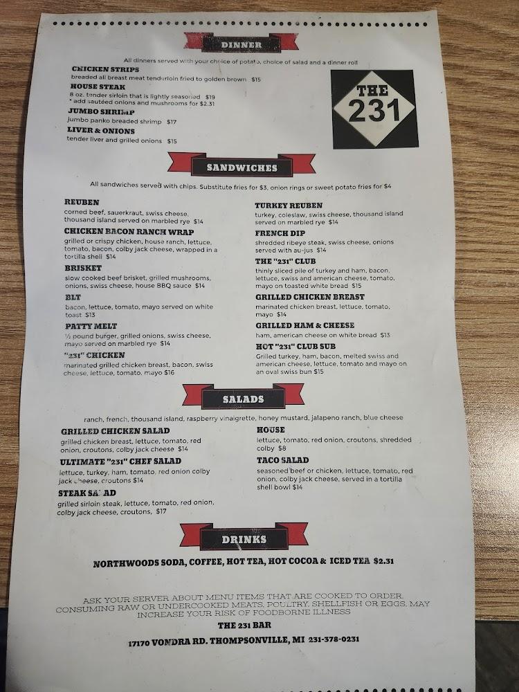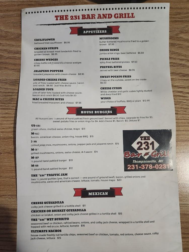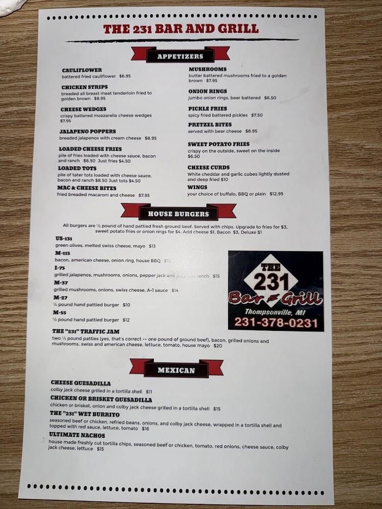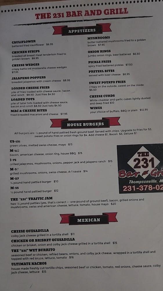 Welcome to The 231 Bar & Grill, your go-to destination in Thompsonville, MI, for a casual yet vibrant dining experience. Nestled at 17170 Vondra Rd, we offer a diverse menu featuring local specialties and classic grilled dishes, all at an affordable price range of $10-$20. Enjoy our delicious cocktails and extensive beer selection while taking part in our lively events, including karaoke and live concerts. With convenient services like takeout, delivery, and a wheelchair-accessible environment, we cater to everyone. Whether you're here for lunch, dinner, or just a drink, our friendly staff ensures a memorable visit!